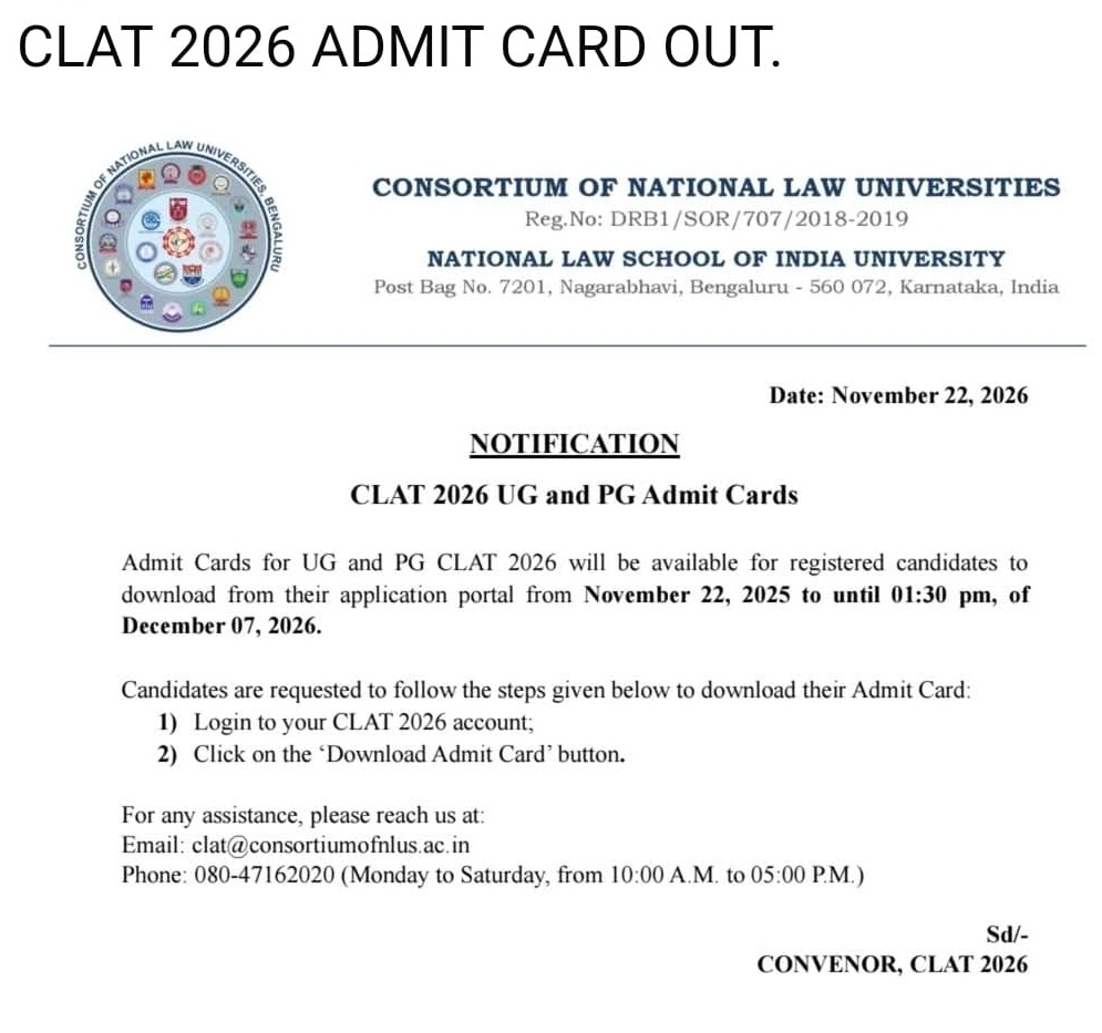 शिक्षा CLAT 2026 का एडमिट कार्ड जारी, उम्मीदवार 7 दिसंबर 2025 तक कर सकेंगे डाउनलोड Dehradun Milap November 22, 2025 0 कॉन्सोर्टियम ऑफ नेशनल लॉ यूनिवर्सिटीज (CNLU) ने कॉमन लॉ एडमिशन टेस्ट (CLAT) 2026 के लिए […]